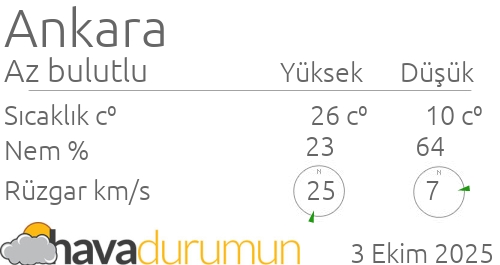Hava durumu 15 günlük, www.havadurumu15gunluk.xyz web sitesi olarak meteoroloji ankara hava durumu tahmin raporlarını sunmaktadır.site güncellenmesi 20 dakikada bir yapılır. Önemli şehirlerimizin hava durumu için sitemizi takip edebilirsiniz. Havadurumu30gunluk.net sitesi, hava durumu 30 günlük tahminlerini ziyaretçilerine sunar. Hava tahminleri 30 günlük hava durumu, 15 günlük hava durumu ve hava durumu 25 günlük taminler doğrultusunda raporlanır. Sitemiz ilk 3 günün saatlik hava durumu tahminlerine yer vermektedir.
